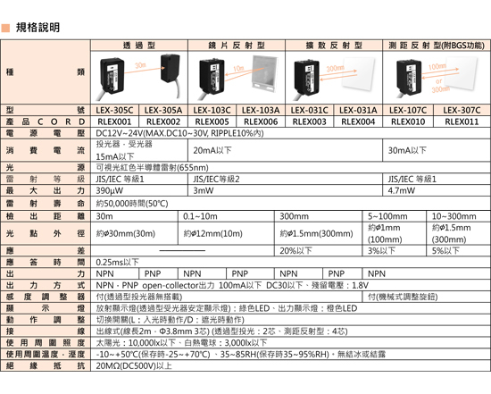 產品種類齊全有:光電器、計數器、光資料傳送裝置、雷射測距、近接開關、高精度變位器、超音波檢知器與各種高精度變位器、迴轉接頭、旋轉接頭、曲折繼手,應有盡有,從傳統產業─紡織、鋼鐵、塑膠、橡膠進而高科技產業的晶圓代工、液晶面板均廣泛使用。