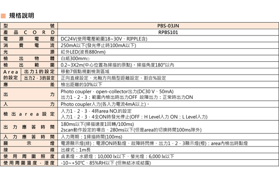 ● 動作原理為LED(λ=880nm)光線呈半圓型180°面的掃描